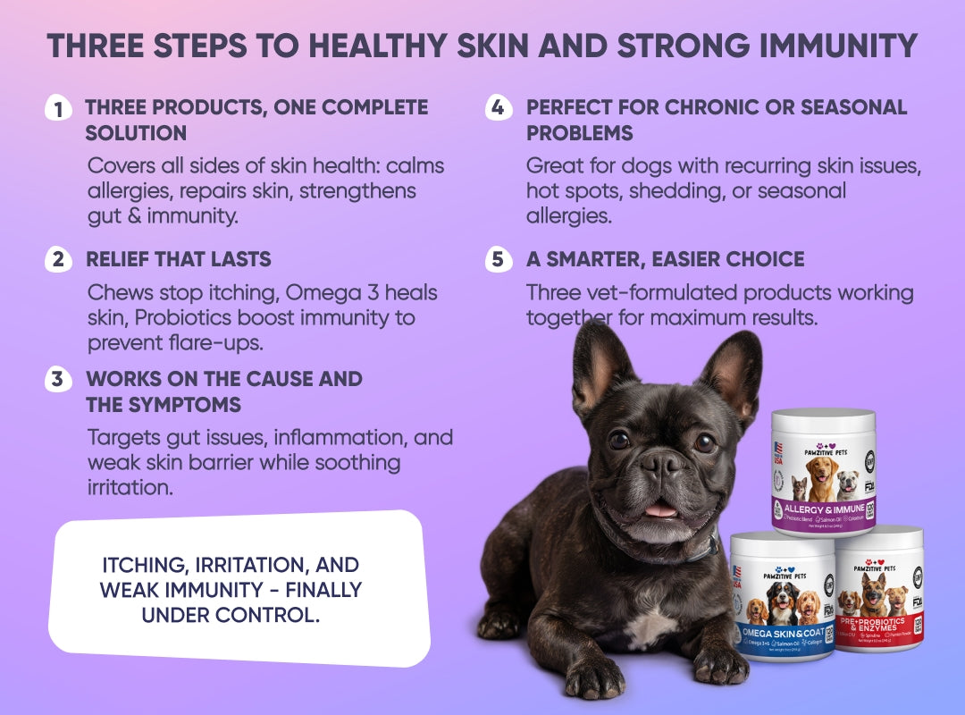 Give your dog the most complete care for allergies, skin, digestion, and immunity with the Full Skin & Immune Booster Bundle. This 3-in-1 solution combines Dog Allergy Chews for Itchy Skin, Omega 3 for Dogs, and Probiotics for Dogs Digestive Health to stop itching, repair skin, and strengthen your dog’s immune system from the inside out.
