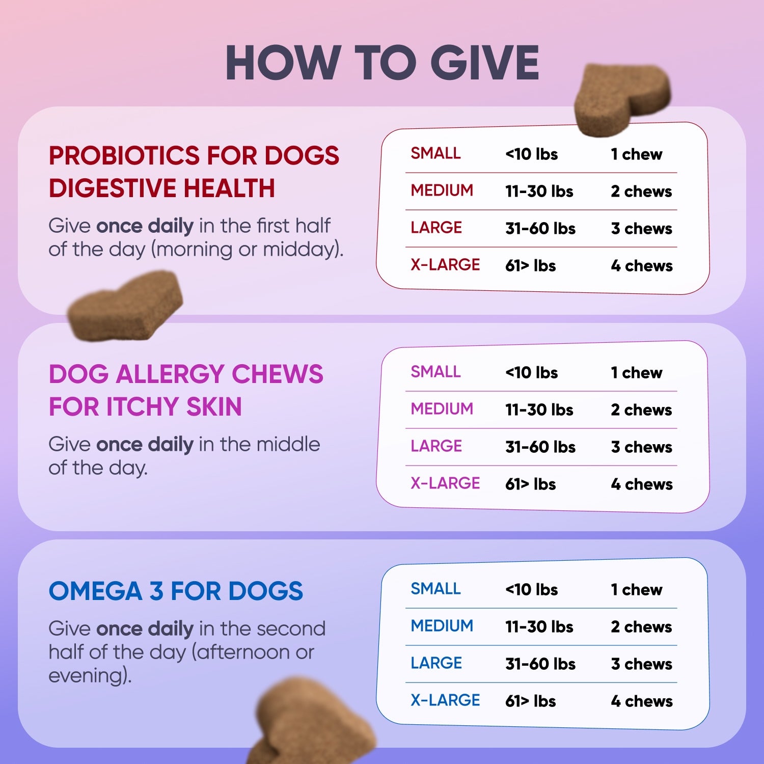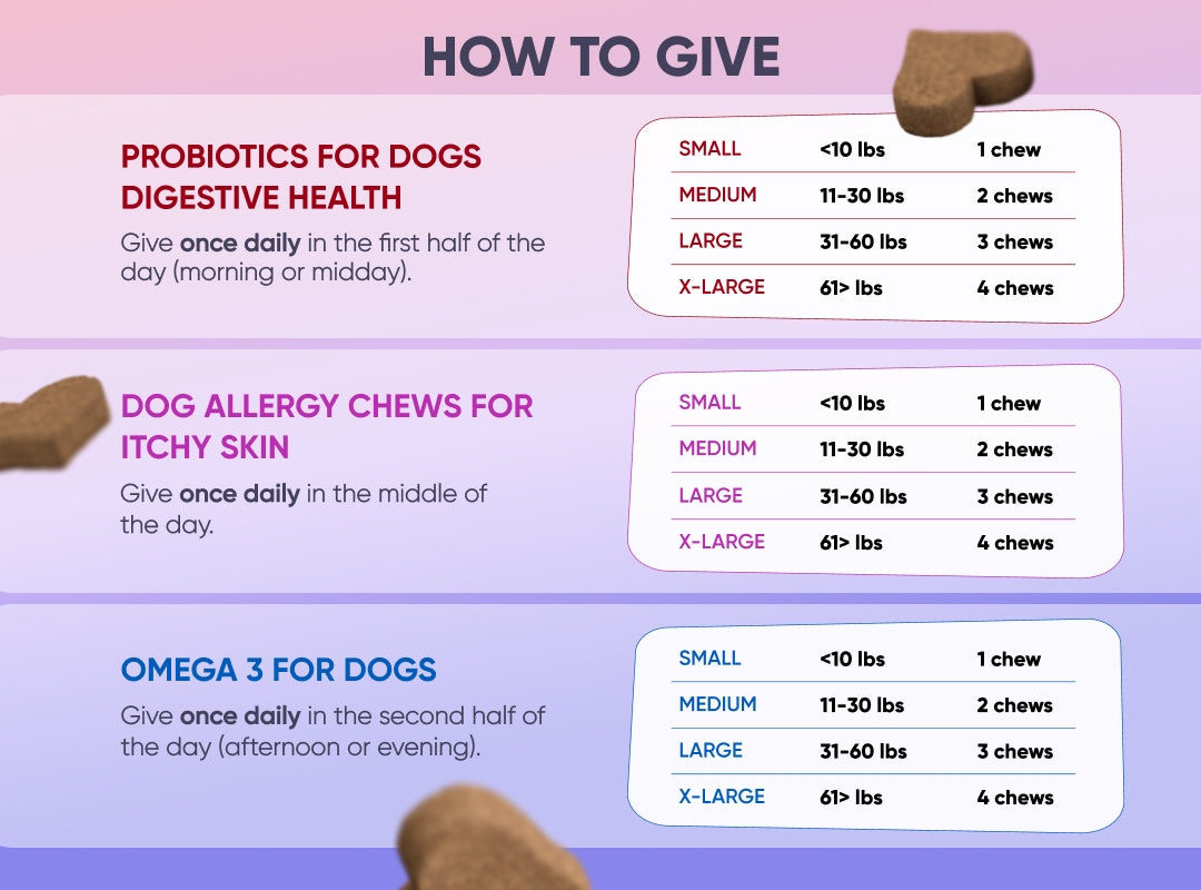 - Small (<10 lbs): 1 Probiotic Chew (Morning) + 1 Allergy Chew (Midday) + 1 Omega 3 Chew (Evening)
