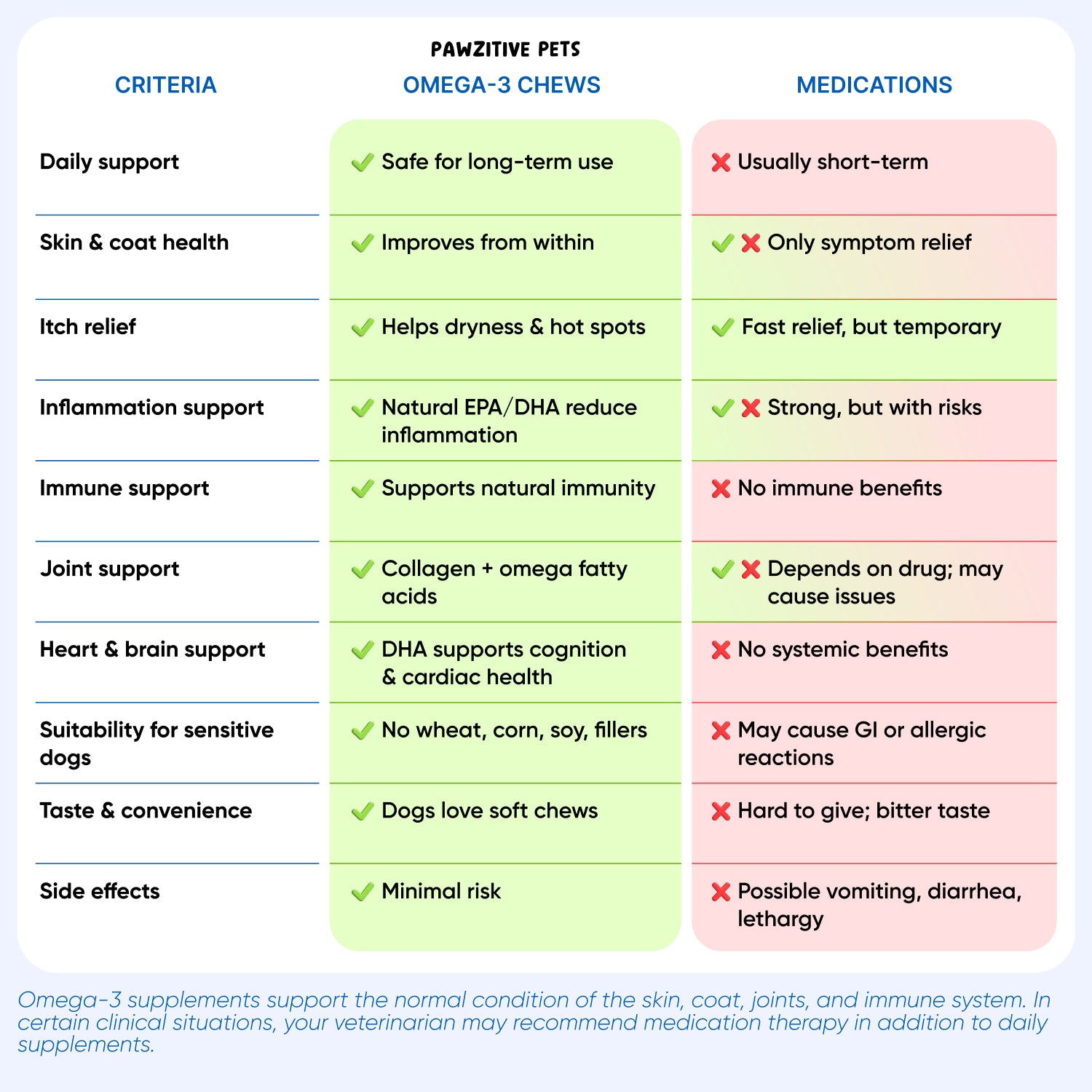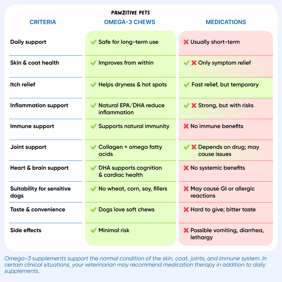 Whether your dog struggles with itchy skin, seasonal shedding, joint stiffness, or simply needs a nutritional boost — our chews provide daily support for comfort and vitality. Help your pup look and feel their best with Omega Skin & Coat Chews — because a healthy coat starts from within.